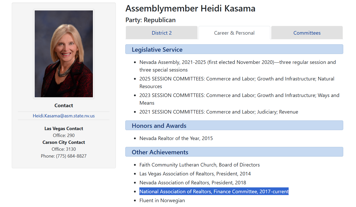 Since 2017, Corrupt Heidi Kasama has served on the finance committee of the National Association of Realtors PAC—a role she even highlights in her official State Assembly biography.